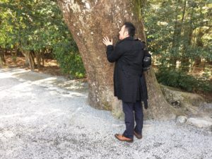 朝から温泉に入ったり優雅な時間を過ごしてたら集合時間に遅れそうになりました。朝ごはんを食べる時間がなかったので、川村さんの奥さんからいただいたチョコレートパウンドケーキを朝食にして、車に乗って伊勢に向かいました。本日のアテンドは植村さんです。まずは笹原さんの大好きな伊勢神宮へ。外宮、内宮の順番で参拝。正しい順序らしいです。写真は岡田さんが大きな木からパワーをいただいているところです。その後、内宮のおかげ横丁でお昼です。伊勢うどんを初めて食べました。最初のイメージはコシがなくてふやけてぐずぐすのうどんで美味しくないご当地B級うどんくらいにしか思っていませんでしたが、わりと美味しくてびっくり。もう伊勢うどんの悪口はやめようと思います。そして牛丼をはしご、伊勢の牛丼はいわゆる焼肉丼でした。生卵を一つ落として食べるととても美味しい!これは好みの味です。そして、植村さんが赤福もちよりもおすすめだという「へんば餅」を食べて(美味しい!)、リニューアルされて間もない植村さんのお店へ。