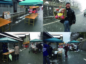 開店後くらいから雪がしんしんと降り始めて、すぐに道を真っ白にしました。そんな天候にもかかわらず、多くのお客様にうどんと鯖寿司をお買い上げいただきました。初めてえびす祭に参加したのですが、愛宕祭に比べて時間がゆっくり流れているよう感じで楽しく過ごすことが出来ました。