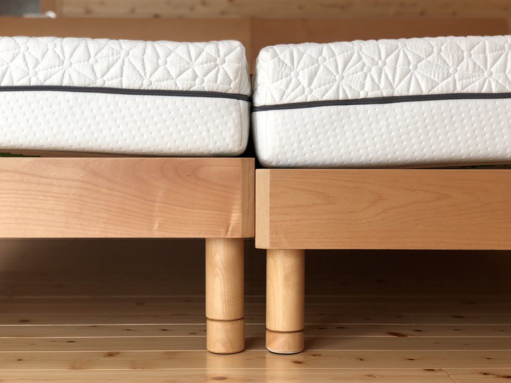 厚みの20mm違うマットレスでした。普通ならば2台並べると20mmの段差が出てしまいますが、今回は納期もありましたので段差が無くなるように高さの加工をさせていただきました。