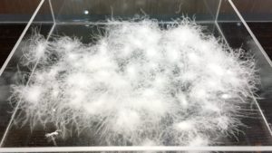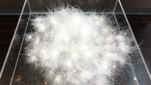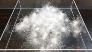 年間生産量は約600kgの貴重なダウン。アニメックス社では、飼育期間が長く成熟したマザーグースのダウンを、一つひとつ手選別(ハンドセレクト)したプレミアムなダウンがあります。目視で一つひとつ大きなダウンだけハンドセレクトしたダウンは、アイダーダウンのように一つひとつ絡み合い、粘り気があります。そんなスティッキーダウンは保温性も高く、ゴミも少なく吹き出しにくいという特徴があり、超軽量タイプの高通気度羽毛ふとん生地に最適なダウンとなります。
